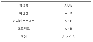일반 집합 연산자 : UNION(합집합), INTERSECTION(교집합), DIFFERENCE(차집합), CARTESIAN PRODUCT(교집합)