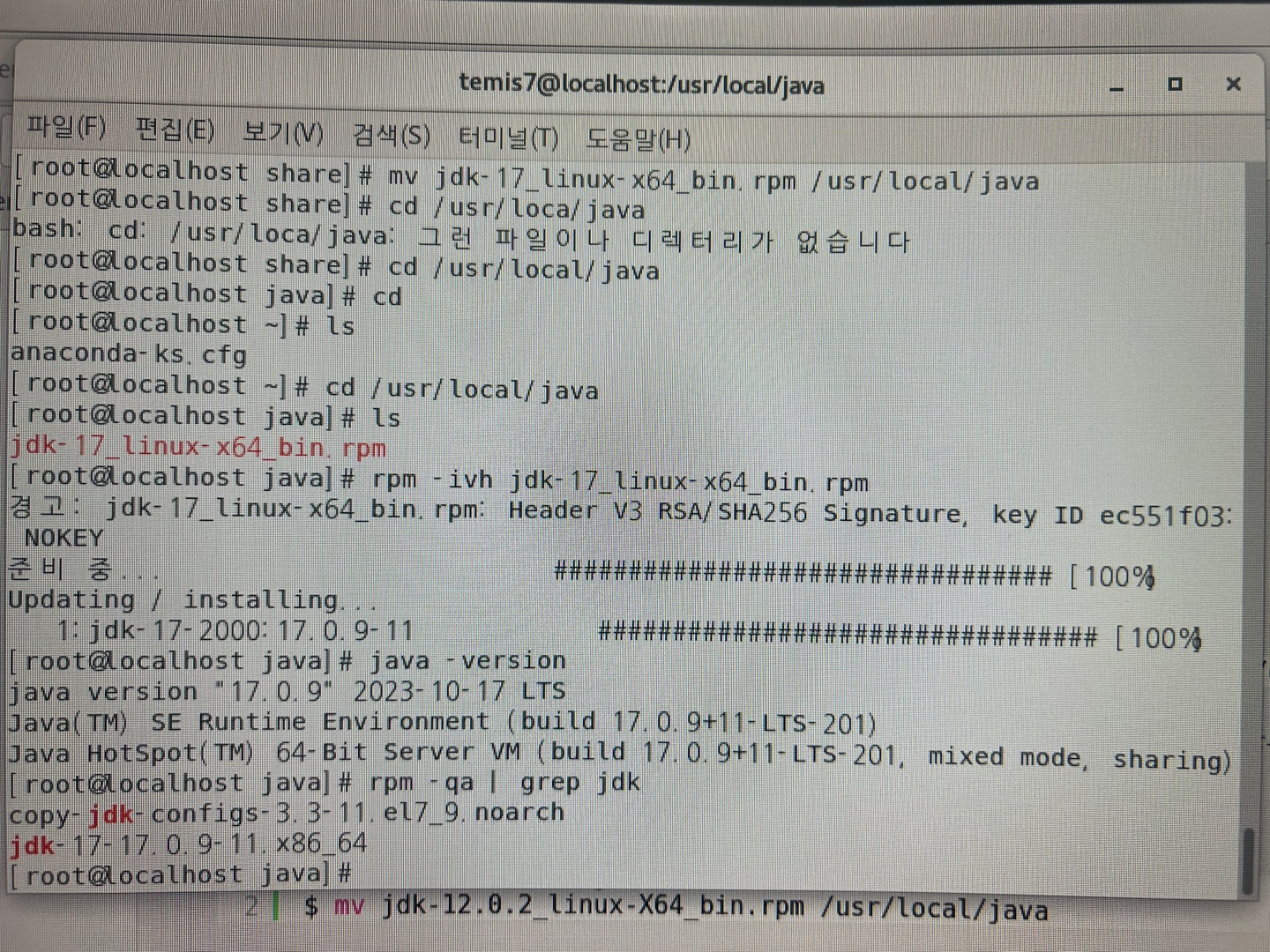 - rpm -qa | grep jdk :시스템에 설치된 모든 RPM 패키지를 나열( rpm -qa )하고 그 중에서 'jdk' 문자열을 포함하는 항목만 필터링( grep jdk ) 합니다.
