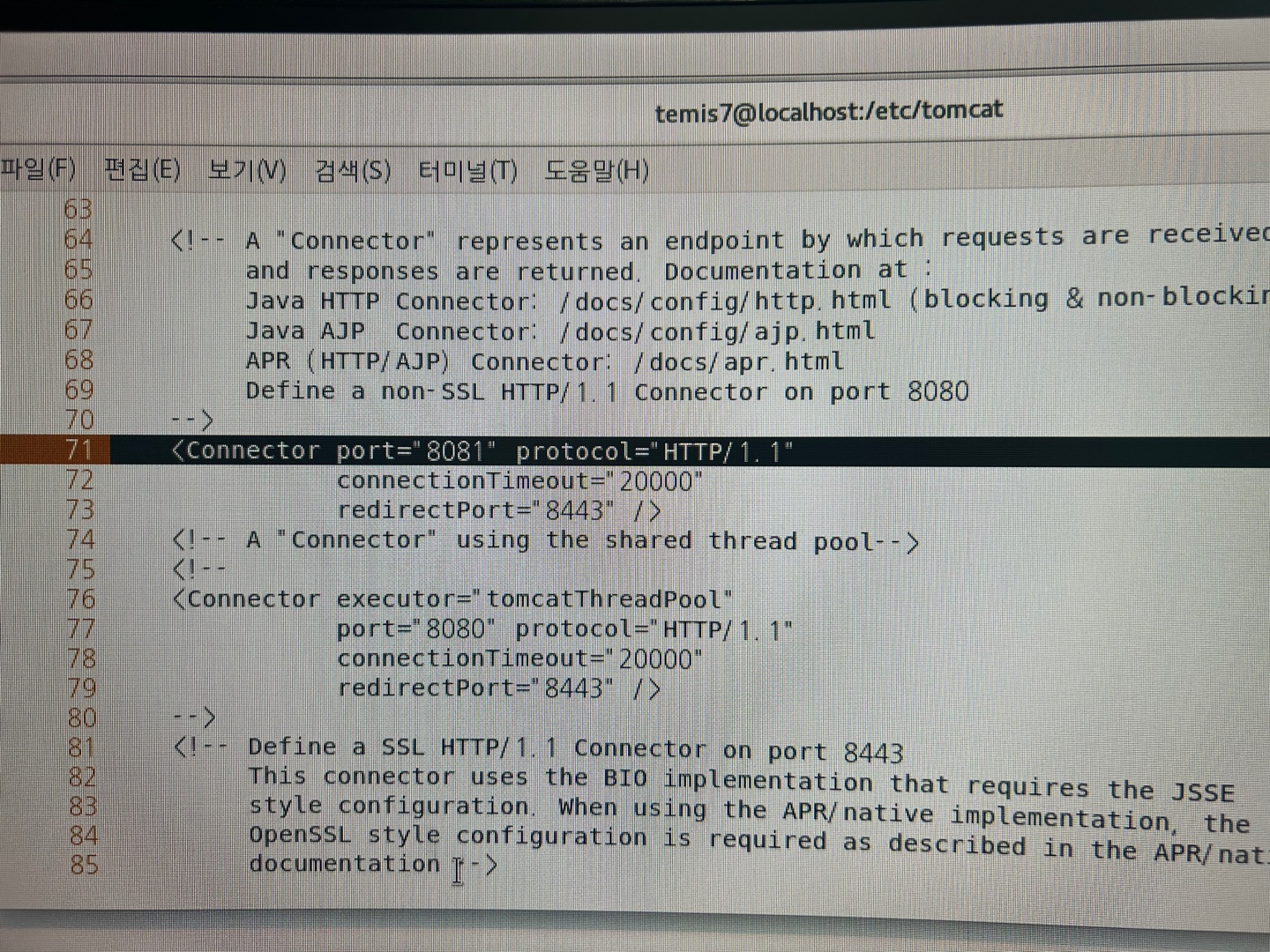 - 해당 8080 포트 찾아서 다른 포트 설정 대략 70번 라인 근처에 있음