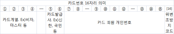 신용카드와 체크카드 번호는 XXXX-XXXX-XXXX-XXXX 형식으로 4자리씩 총 16자리로 구성된다. 아멕스 신용카드 처럼 일부 카드는 15자리도 있지만 대부분은 16자리이다. 이 중에서 앞자리 6개는 국제식별번호이며 BIN (Bank Identification Number)이라고 부른다.