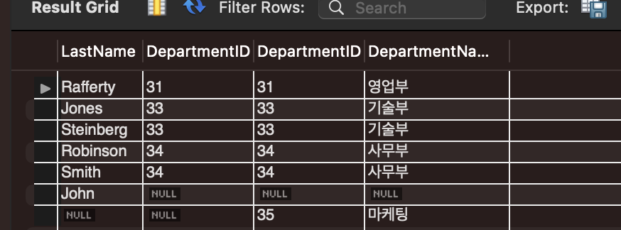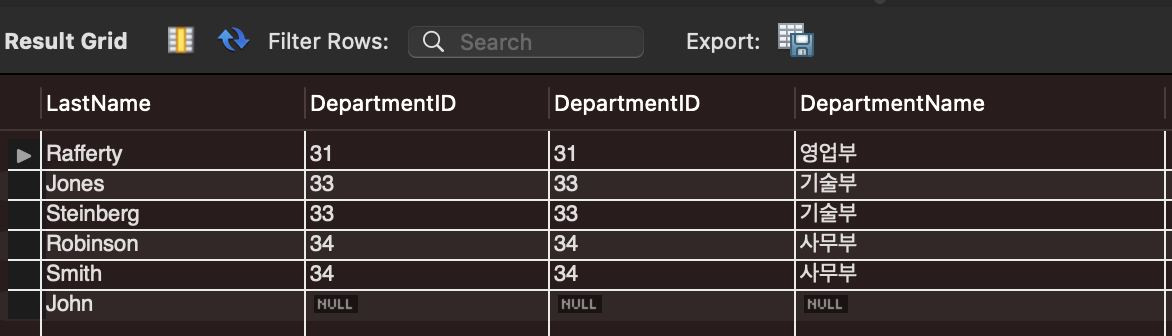 - 왼쪽 테이블의 모든 행과 오른쪽 테이블에서 일치하는 행을 결합합니다. 오른쪽 테이블에 일치하는 행이 없는 경우, 해당 행의 오른쪽 테이블 컬럼을 NULL로 채워집니다.