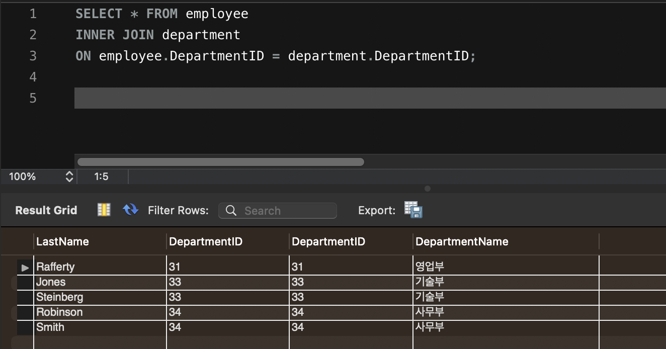 두 테이블의 DepartmentID 컬럼을 이용해서 Employee 와 Department 테이블을 조인할 것이다. 이 두테이블에서 DepartmentID가 일치하는 곳(즉, 조인 구문이 충족되는 곳)에서 쿼리는 LastName, DepartmentID와 DepartmentName 컬럼을 결과 열로 결합할 것이다. DepartmentID가 일치하지 않는다면, 어떠한 결과 값도 생성되지 않을 것이다.